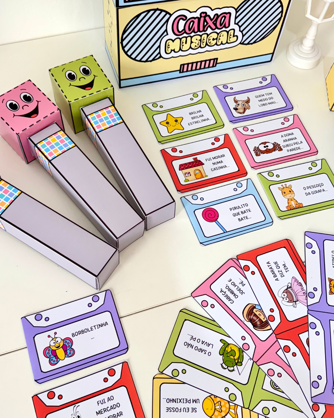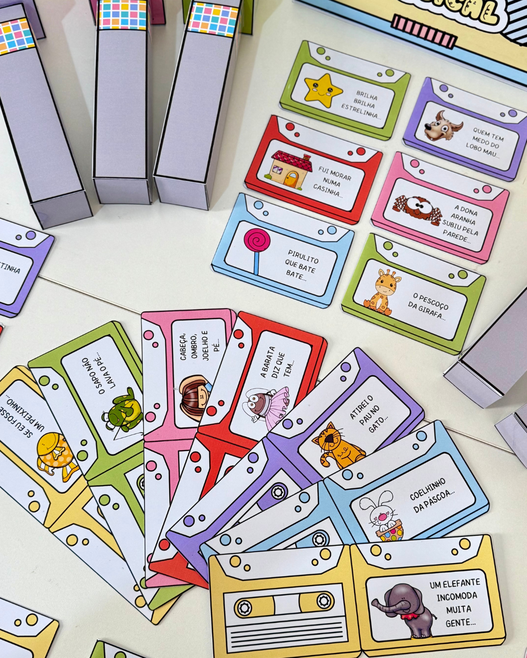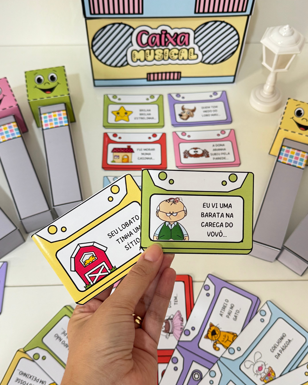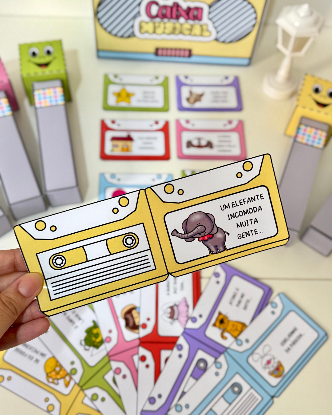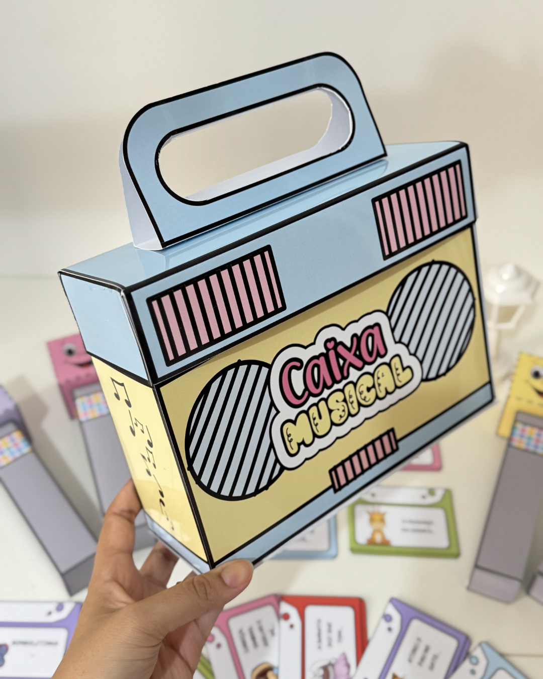 Kit Caixa Musical – diversão garantida em sala de aula. Acompanha fichas ilustradas, microfone em várias cores, caixa em formato de rádio e vídeos tutoriais. Arquivo em PDF pronto para imprimir.
