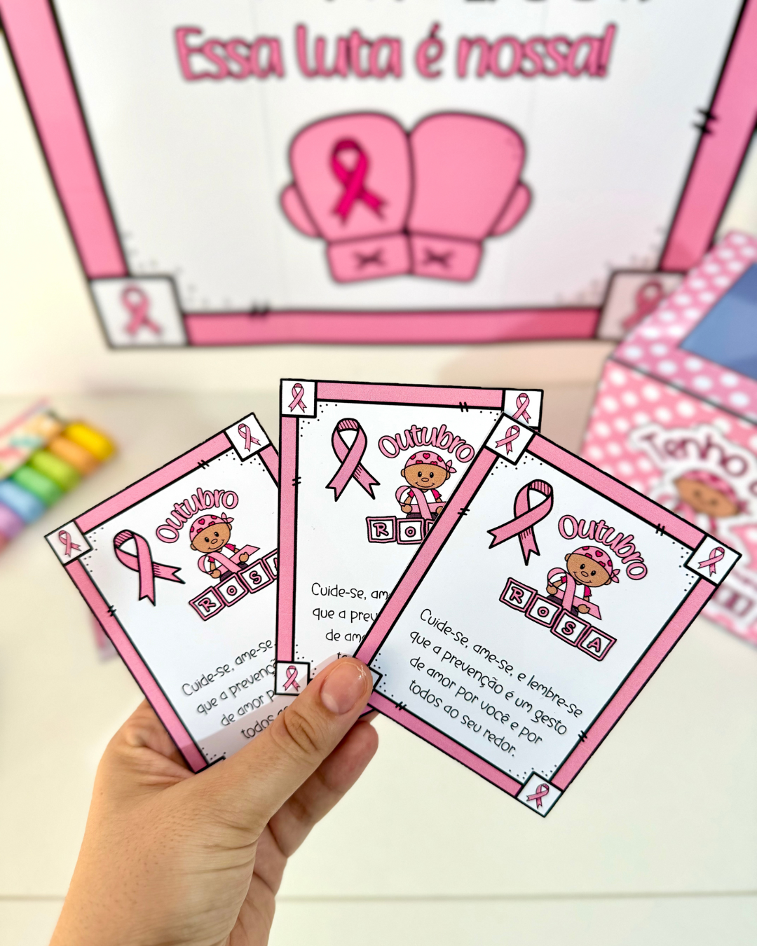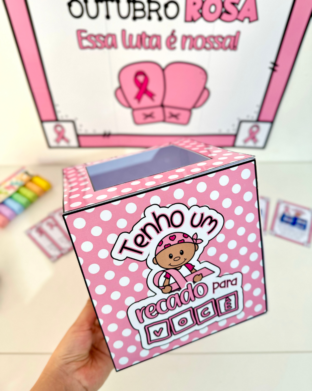 Kit tema Outubro Rosa para trabalhar o tema com turmas de Educação Infantil e séries iniciais do Ensino Fundamental. O kit inclui: Caixa (acompanha tutorial), Cartão lembrancinha com frase, Cartaz já ampliado (9 folhas A4). Arquivo em PDF pronto para impressão.