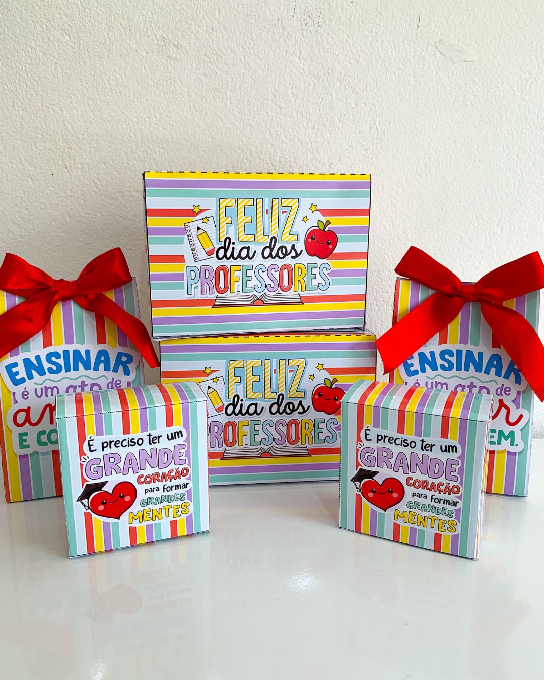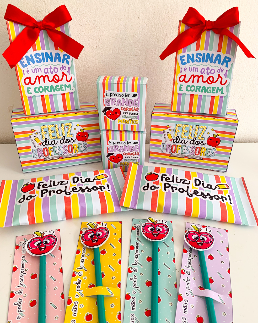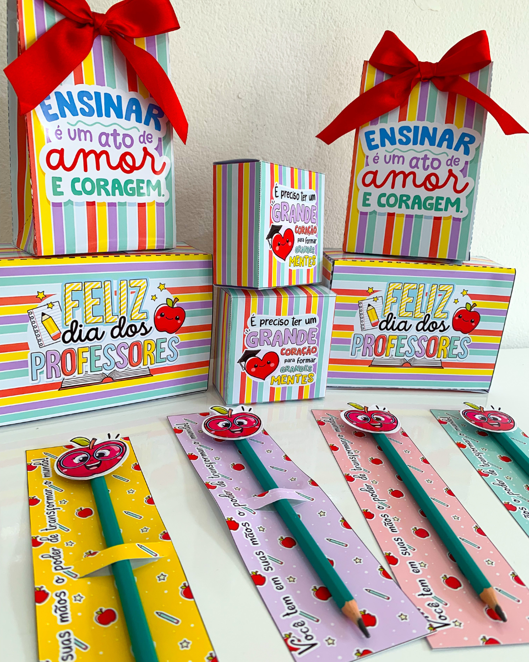 Kit de Lembrancinhas para o Dia dos Professores – material especial com 5 opções para homenagear nessa data tão importante. Inclui caixa grande, caixa pequena, sacolinha, cartão com tag para lápis ou caneta e embalagem para chocolate. Arquivo em PDF pronto para imprimir.